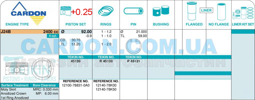 Поршни ремонтные 92mm +0.25mm (к-кт на мотор) Suzuki Grand Vitara J24B, Kiz