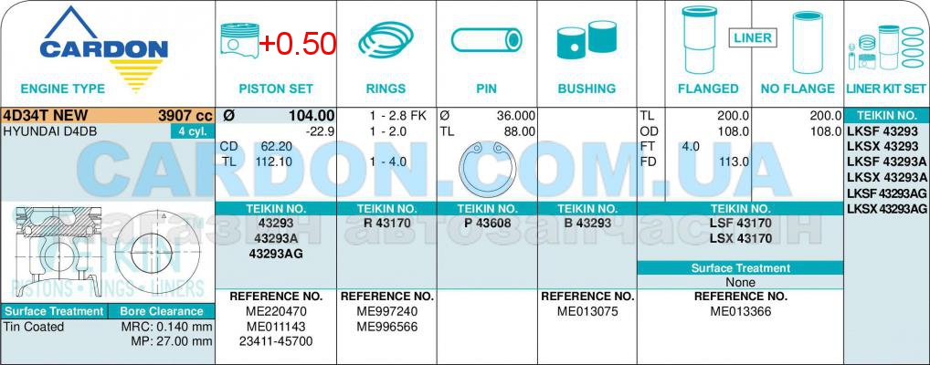 Поршень +0.50mm (цена за 1 шт, продажа по 4шт) Mitsubishi 4D34T, Hyundai HD