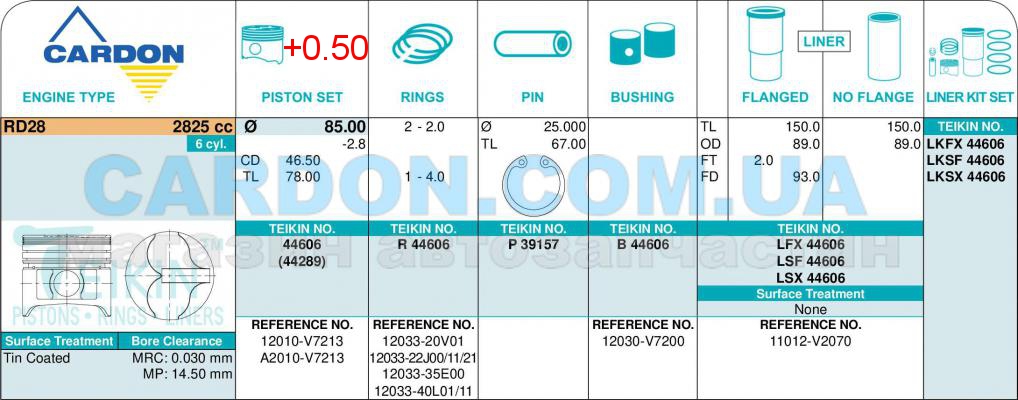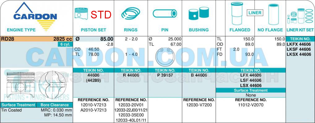 Поршни стандарт (STD) NISSAN - комплект на мотор RD28 - TEIKIN A201081T14 - NISSAN/INFINITI - оригінальні номери та аналоги